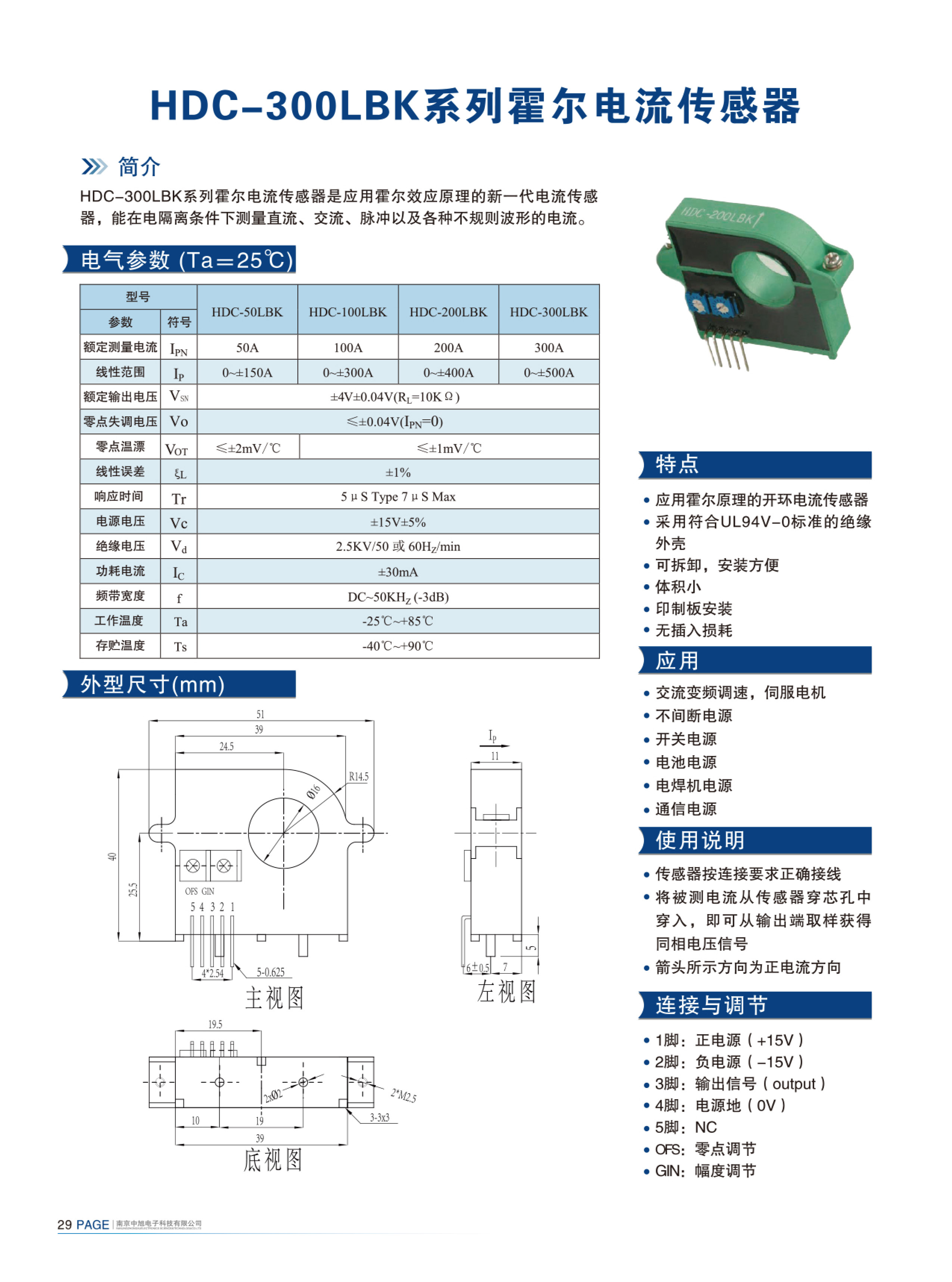 HDC-300LBK系列霍爾電流傳感器是應用霍爾效應原理的新一代電流傳感器,能在電隔離條件下測量直流、交流、脈沖以及各種不規則波形的電流。