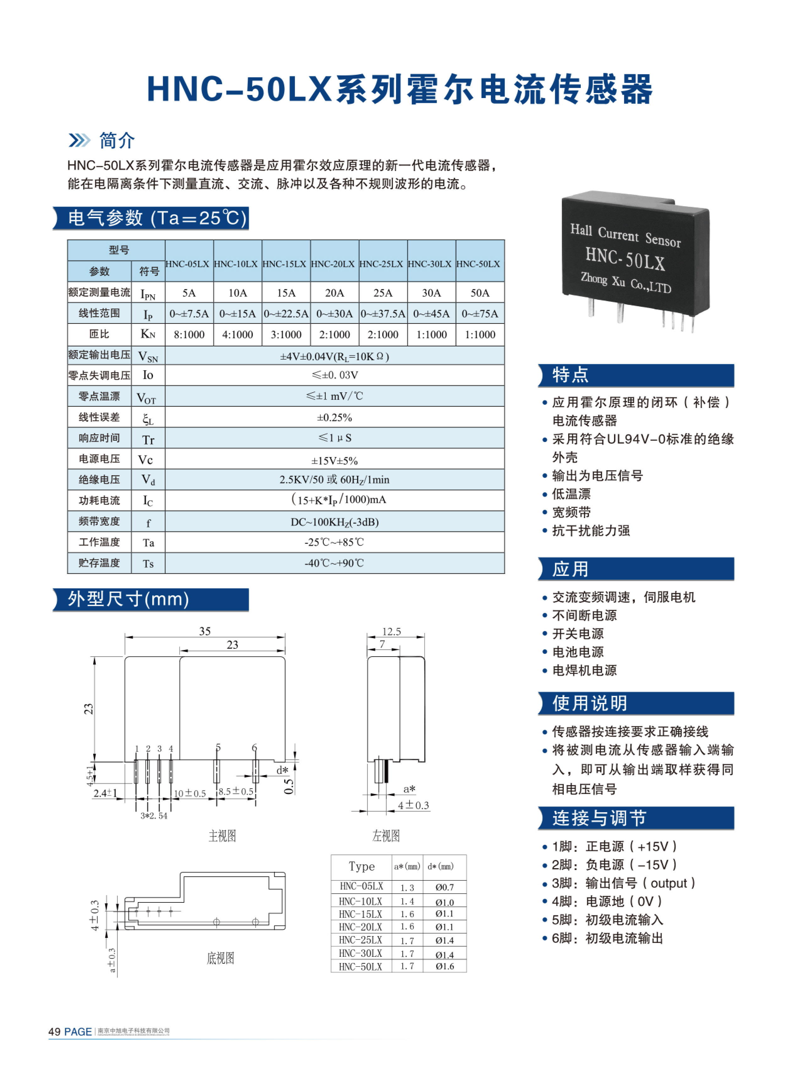 HNC-50LX系列霍爾電流傳感器是應用霍爾效應原理的新一代電流傳感器,能在電隔離條件下測量直流、交流、脈沖以及各種不規則波形的電流。